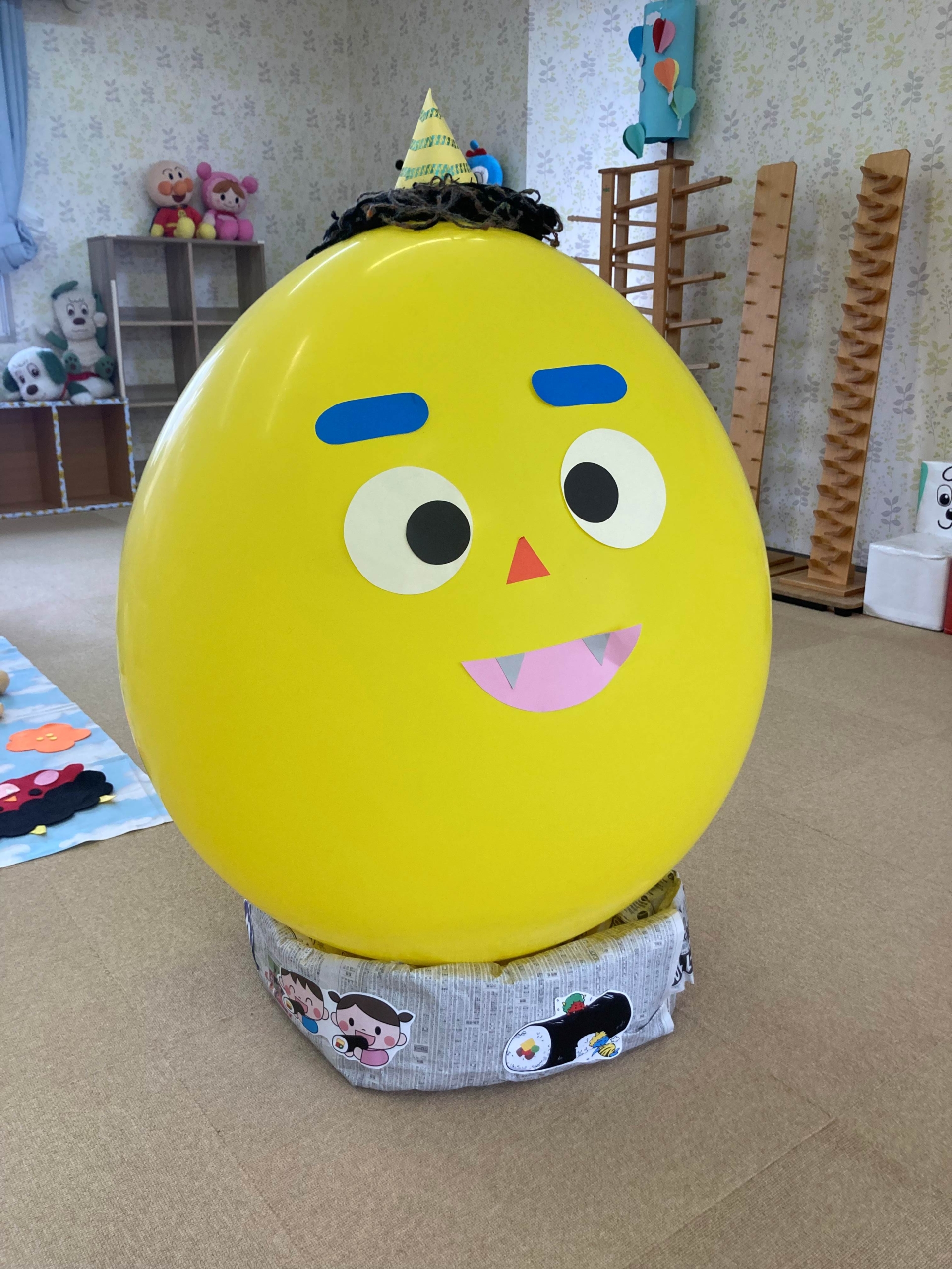小さい風船鬼と大きい風船鬼で、まめまきの練習をしました。