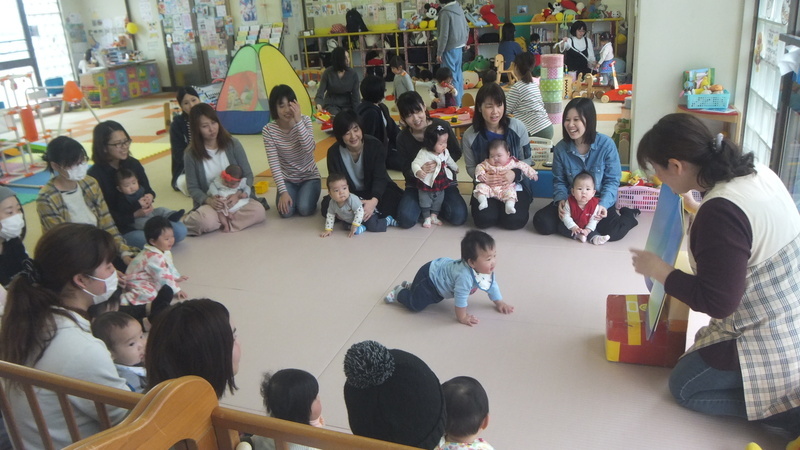 16組の親子が参加し、大型絵本やふれあい遊びを楽しんで、手型のお花を製作しました!(^^)!一年過ぎると大きくなるね~♪