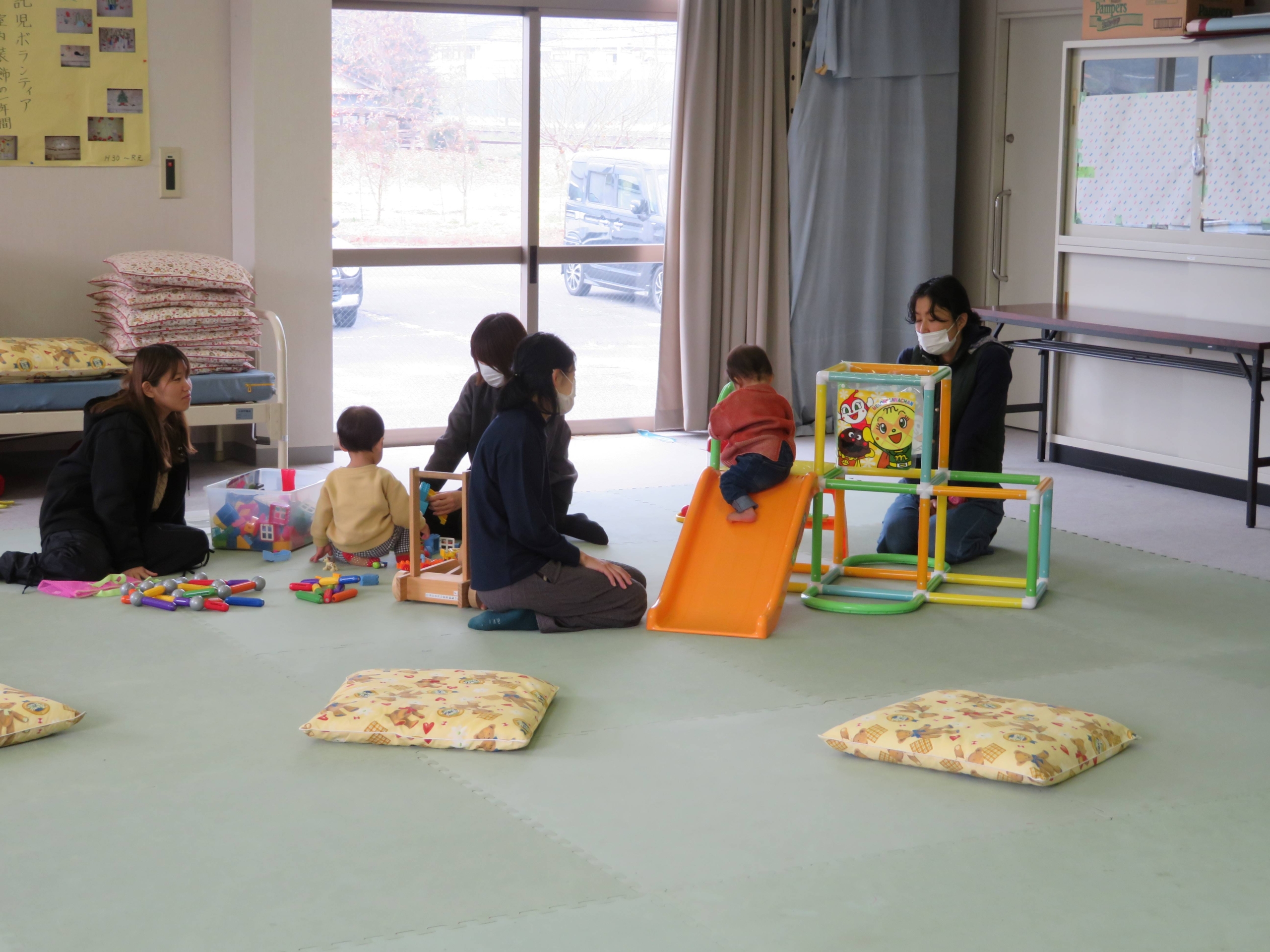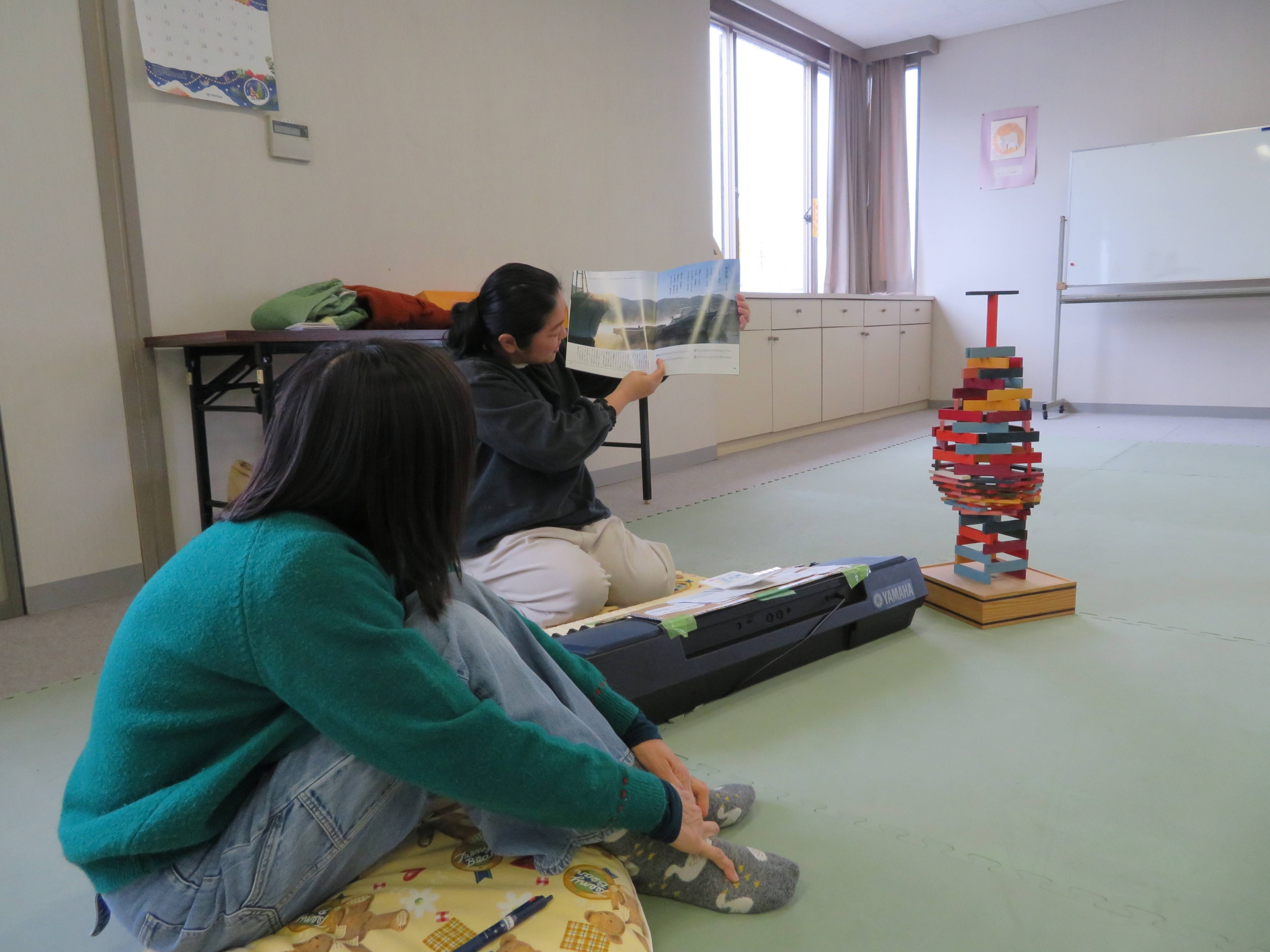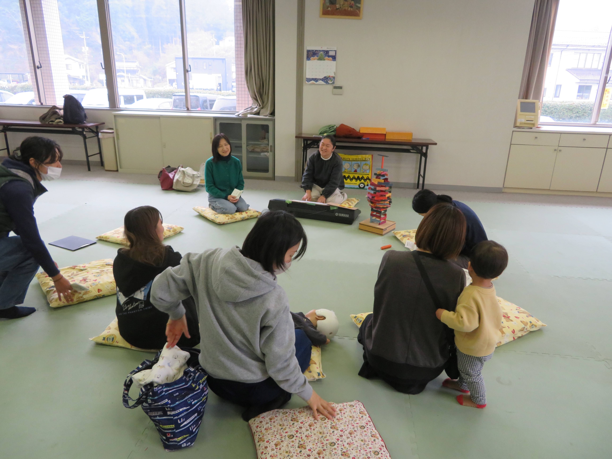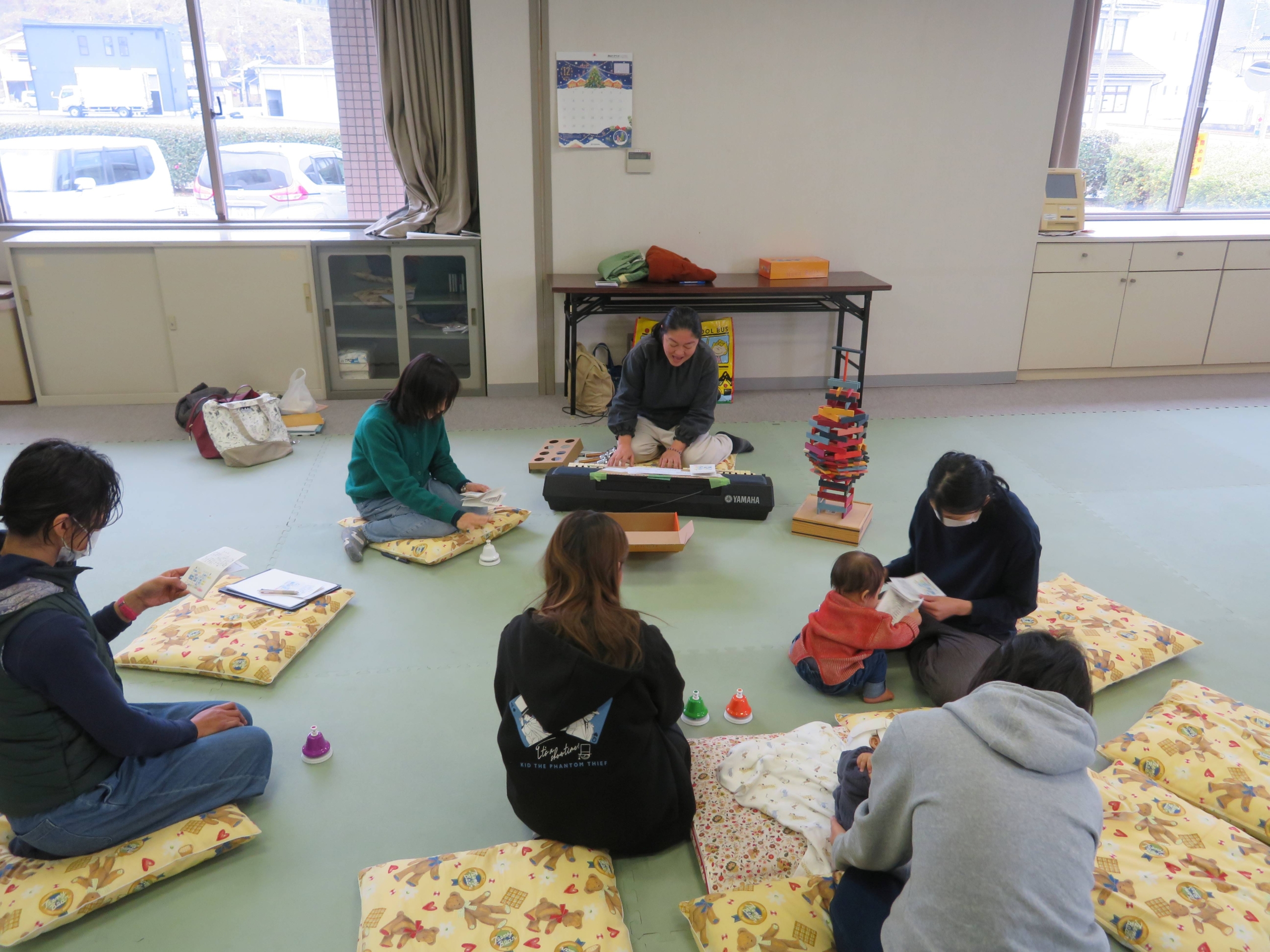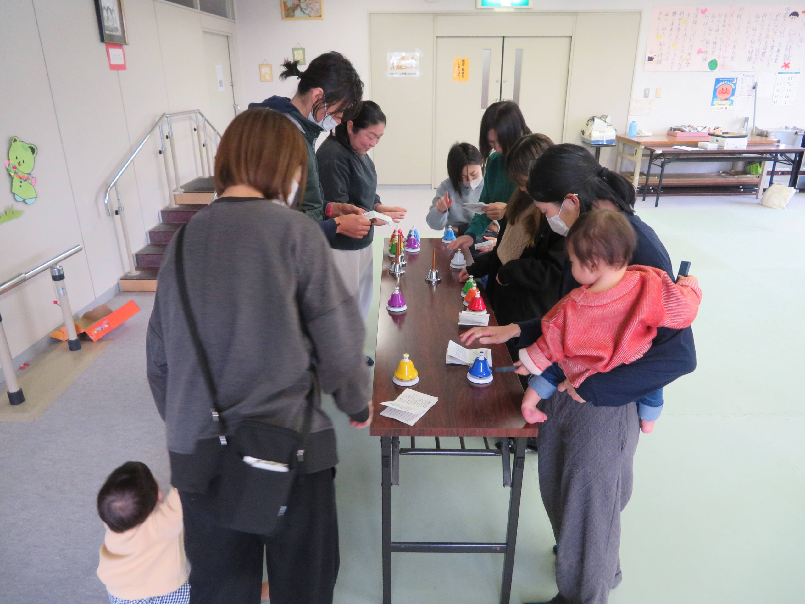 3組の親子と一緒に季節の歌を歌ったりハンドベルを使って演奏をしました。