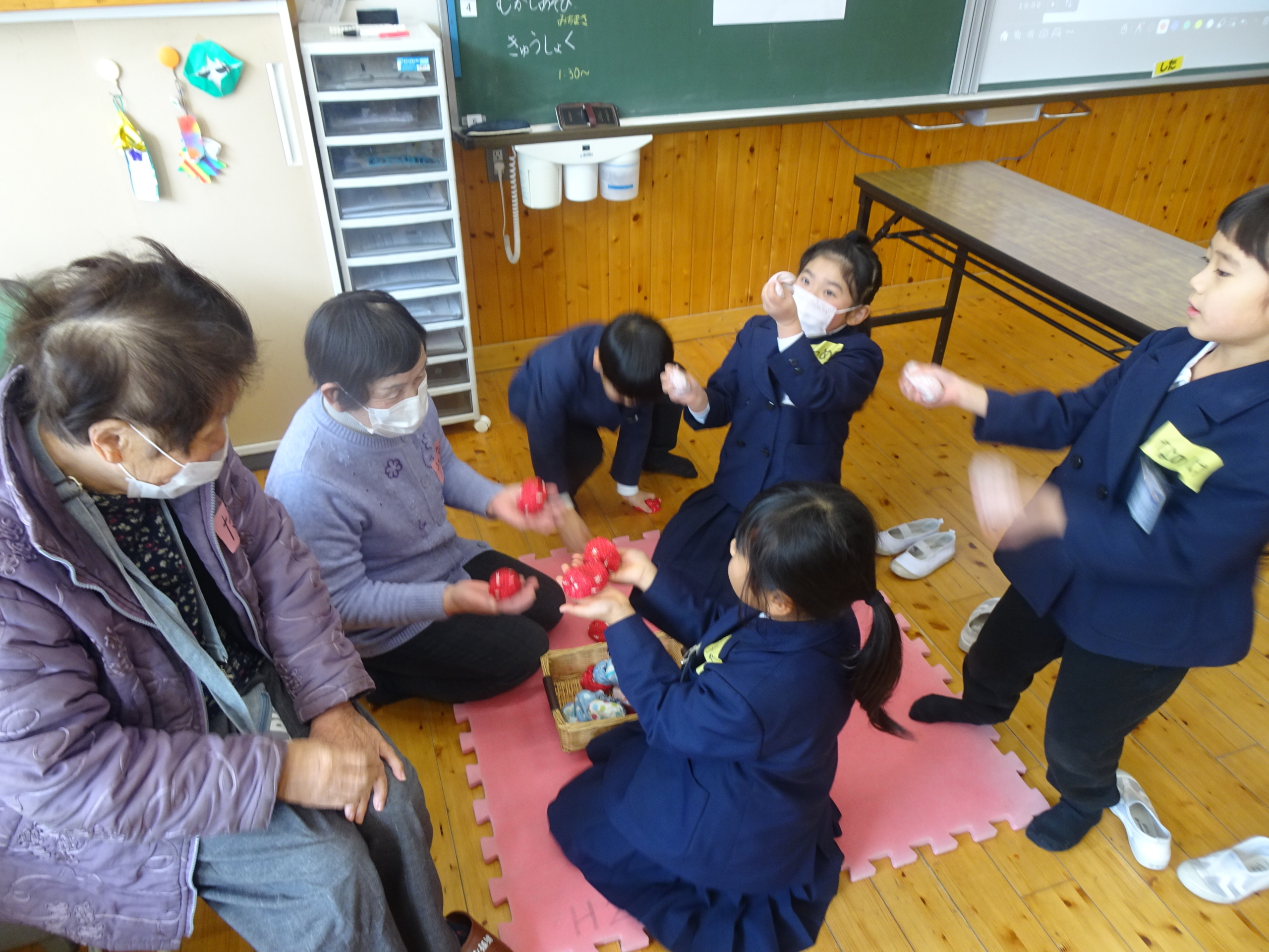 すみれ会、木工クラブの会員11人は、新野小学校1年生と、コマ回し・お手玉・あやとり・かるたとりの4種類の昔遊びをしました。会員は昔を思い出しながら、熟練の技を披露し、子どもたちに丁寧に教えながら一緒に楽しみました。