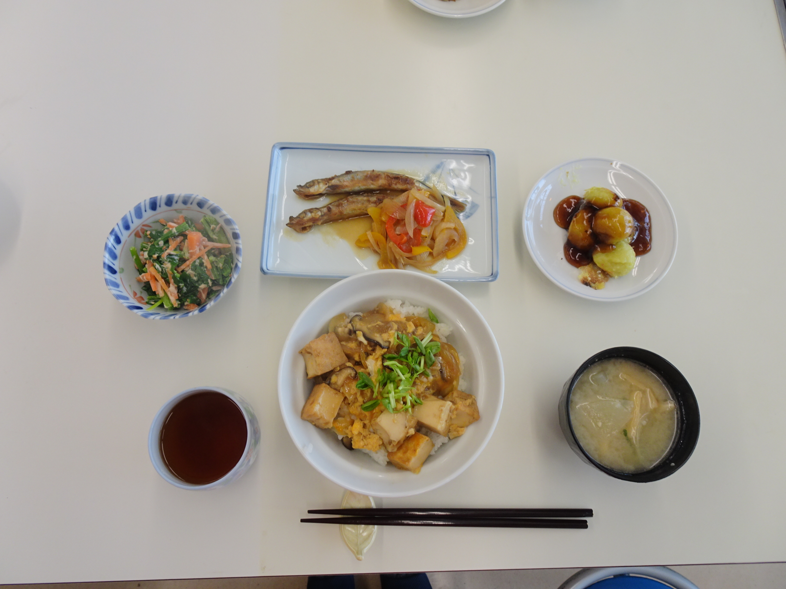 今回のメニューは、・厚揚げの卵とじ丼 ・シシャモの南蛮漬け ・ほうれん草のサラダ ・焼き葱の味噌汁 ・大学芋だんご でした。